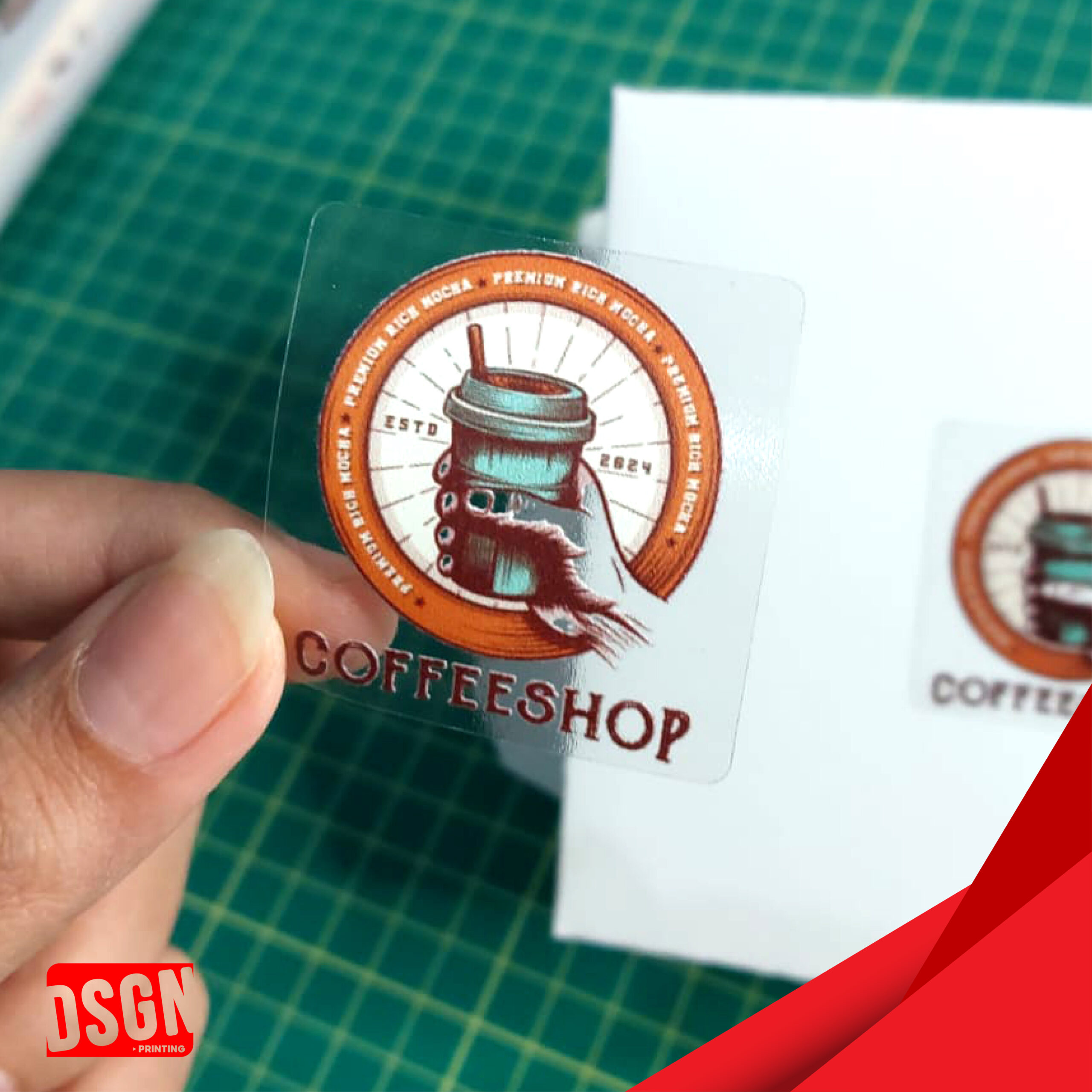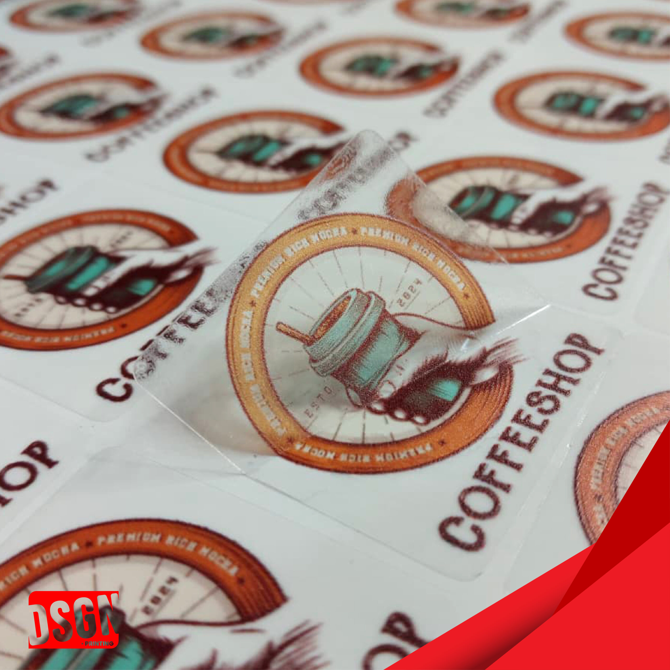 – Stiker Bahan Vinyl Tranparant : Stiker vinyl transparan adalah stiker berbahan plastik vinyl yang memiliki permukaan bening atau tembus pandang, sehingga desainnya terlihat menyatu dengan media yang ditempel. Efek ini memberikan kesan modern dan bersih karena tidak menutupi latar belakang objek. Sama seperti stiker vinyl putih, stiker ini juga tahan air, goresan, dan cuaca. Cocok untuk ditempel di media transparan seperti kaca, botol, toples, atau permukaan berwarna terang. Stiker ini sering digunakan sebagai label produk, dekorasi jendela, atau branding untuk kemasan premium.