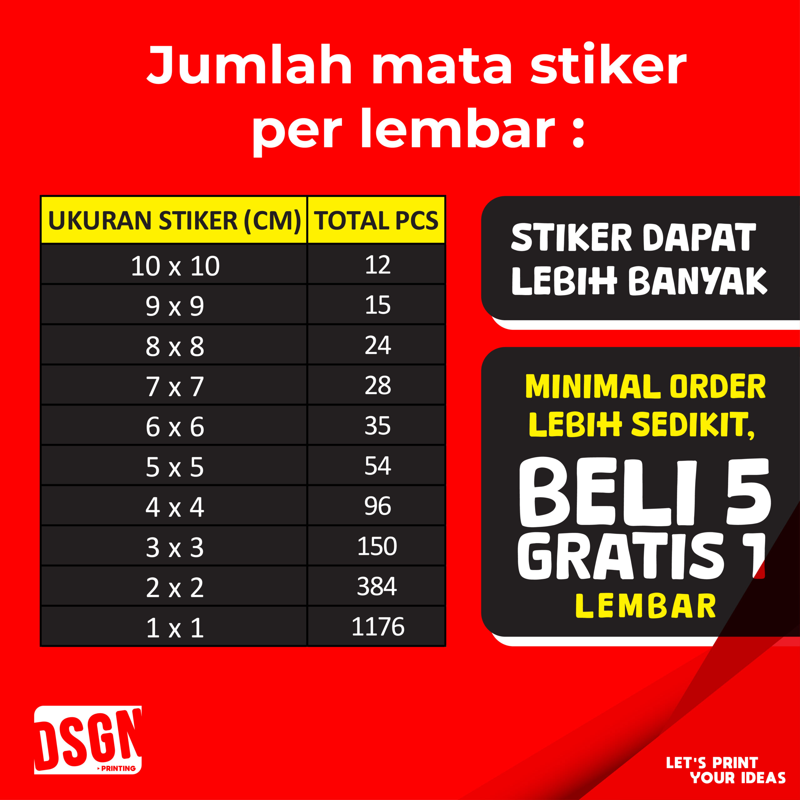 – Hitungan qty adalah hitungan lembar A3+. Untuk isi sticker per paket ukuran dapat melihat slide gambar yg telah disediakan. Anda dapat membagi kebutuhan stiker anda sesuai dengan qty yg diinginkan. Misal anda membutuhkan sticker ukuran 3cm sebanyak 600pcs, berarti qty orderan harus anda masukkan adalah 4pcs yang dimana = 4lbr x 150 (isi paket 3cm) = 600pcs.